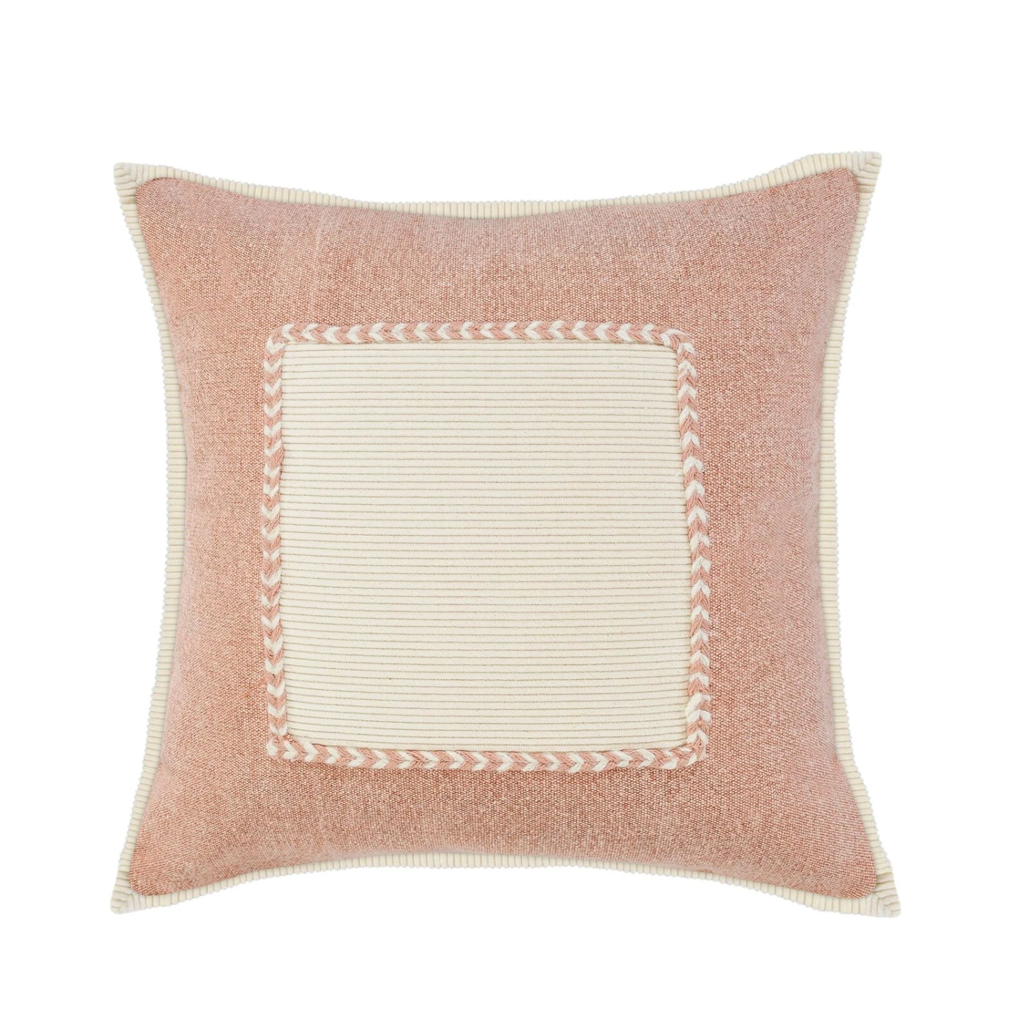 The Riviera pillow collection offers a variety of color combinations in this throw pillow to enhance your cultivated home. It highlights a braided frame design with a soft ribbed cotton interior for a simple yet stylish addition to any space. This piece displays balanced shades of dusty pink alongside soft cream to complete the crisp framework design. The accent offers comfort and style to any room of your choice.