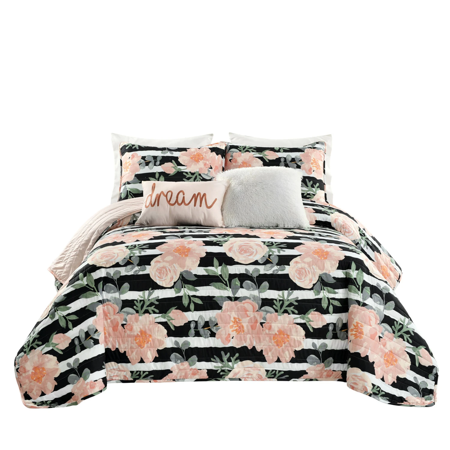 You will love this soft reversible quilt set featuring an elegant floral pattern in watercolor print on the front and a romantic solid dusty rose color on the reverse. This 5-piece set comes complete with 2 pillow shams and 2 stylish decorative pillows.
