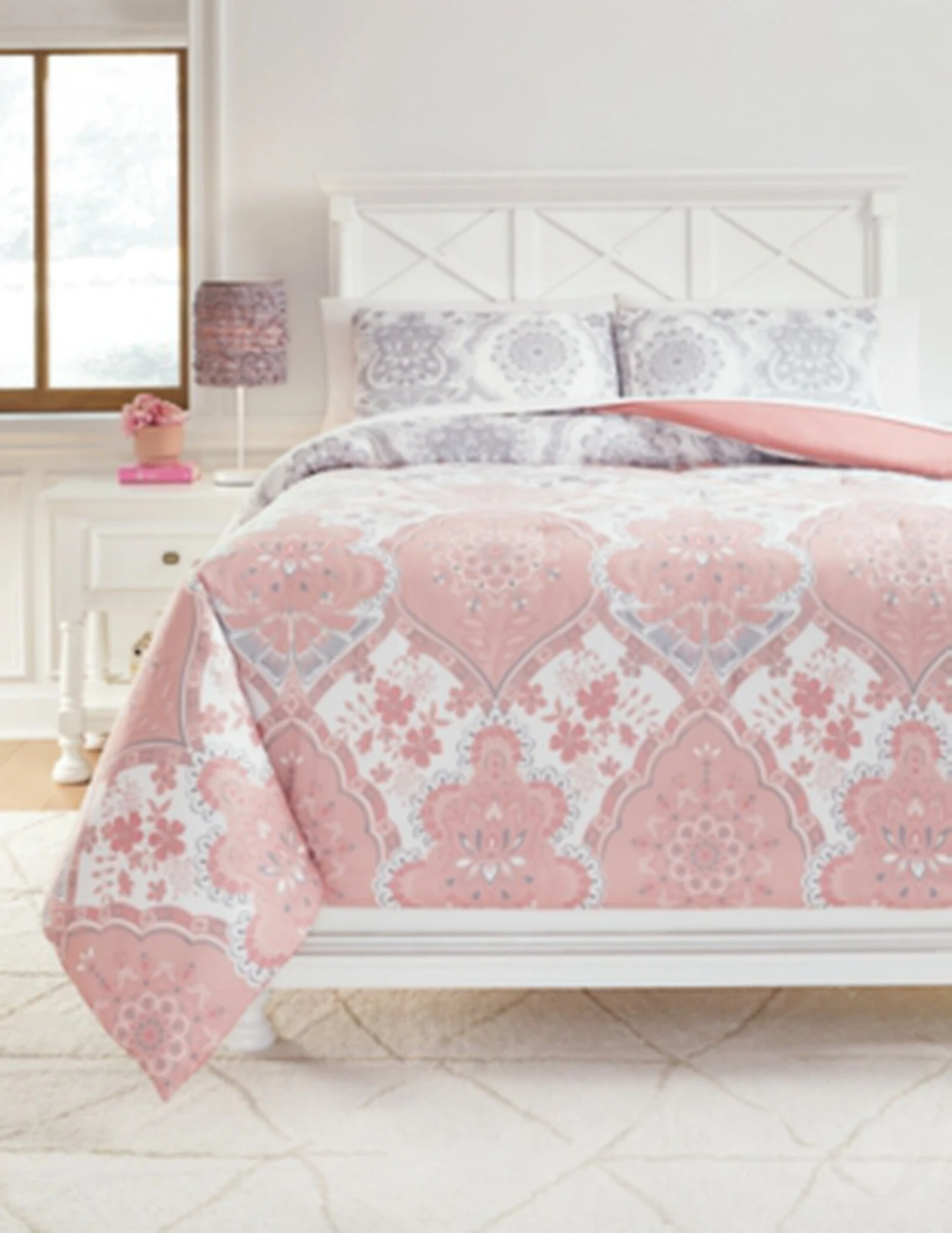 Loaded with high-style twists and turns, this comforter set is the essence of fresh, fun, youthful style. The comforter and shams are solid pink with a ruffle stripe detail that reverses to a mandala and lotus design in pink, white and gray. This comforter set is perfect for your tween or teen’s fashion sense.