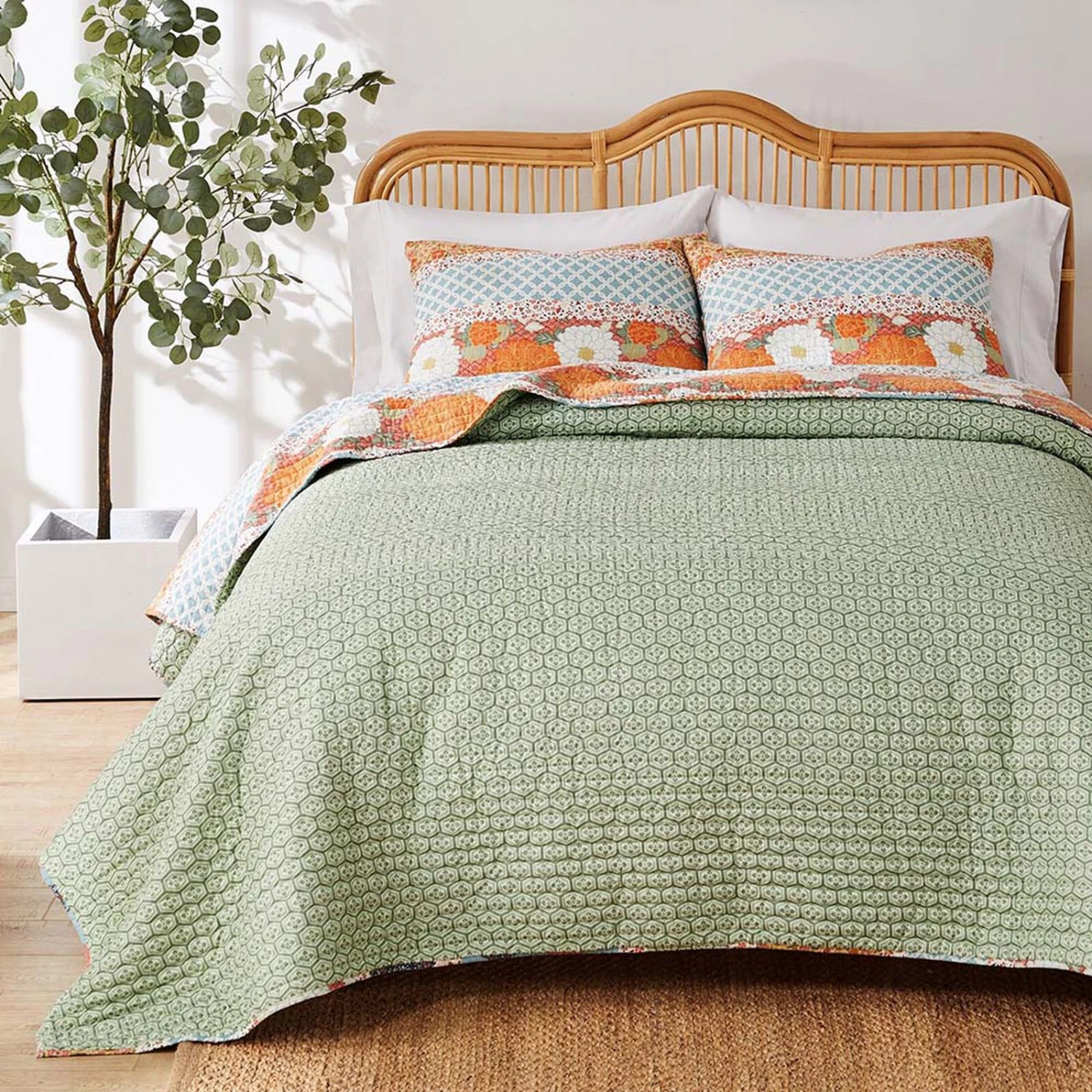 Brighten your bedroom with the fresh, updated colors of this striped print bedding by Barefoot Bungalow. An eclectic blend of dreamy calico patterns in gold, blue, orange, and green creates a cheerful mood. This enchanting quilt set features bright florals and whimsical songbirds and reverses to an all-over coordinating geometric print in green. Vermicelli quilting throughout adds texture and surface interest. Reversible pillow sham(s) complete the look. Oversized for better coverage on today’s deeper mattresses. Prewashed with extra softener for a silky feel and preshrunk for size resilience with fabric bound edges. The quilt set comes with a quilt and two pillow shams (one sham per Twin set). Dimensions: The twin set comes with a 68″x88″ quilted coverlet, plus one 20×26-inch quilted pillow sham. All dimensions +/- 2”. 100% Cotton face; 100% microfiber polyester back; Cotton-rich fill is 60% cotton/40% polyester. Machine Wash. Imported.