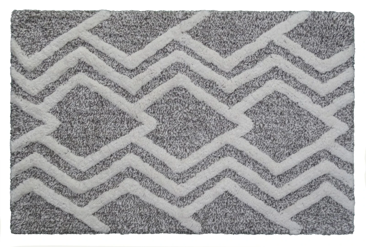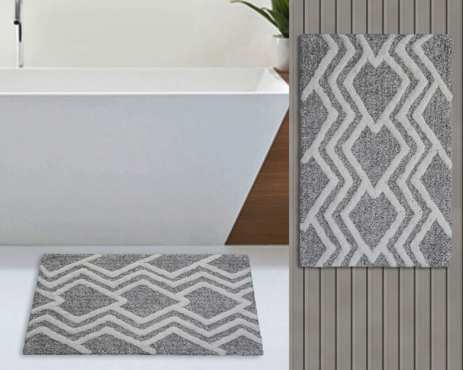 Give an exquisite look to your bathroom with this designer tabletop tufted bath rug. Comes in geometric pattern design. Add Luxurious comfort and fine style to your daily routine with our soft touch of cotton pile. Made of 100% Cotton luxury bath rug. Size 20” x 32”. Designer table top tuffted bath rug. Machine washable bathroom rugs. Should be washed separately. Tumble dry on gentle cycle. Do not bleach. Do not iron. Indoor Use Recommended. Rug pad recommeneded. Contains antimicrobial properties to help reduce the presence of impurities and odors.
