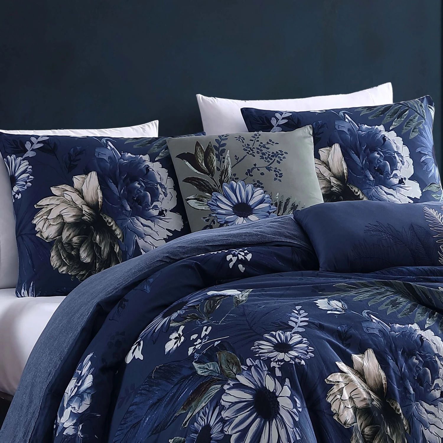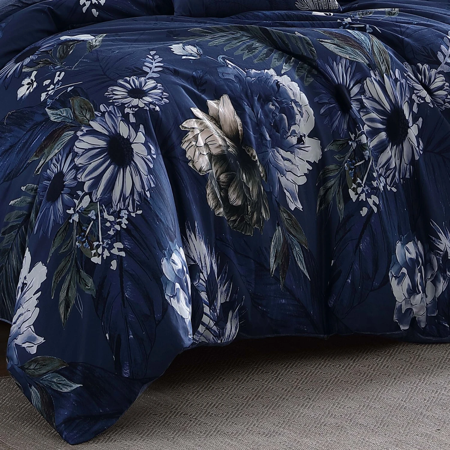 soft and inviting, the lovely floral pattern of the delphine 5 piece comforter set will lull you to sleep. But if you are interested in changing the look of your room, just turn it to the reverse side for a faux denim texture. The navy ground with tones of white and olive are classic for traditional, transitional or contemporary bedrooms. The 5 piece set includes a 100% cotton sateen reversible comforter, 2 reversible shams with embroidered and printed decorative pillows.