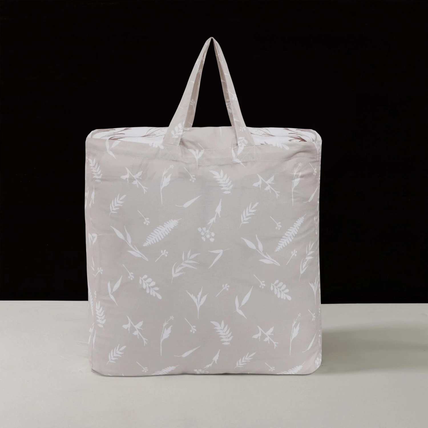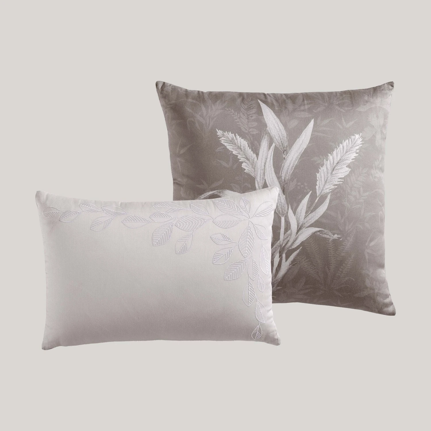 Neutral tones of ivory and tan create this botanical leaf print in the Natural Leaves 5 Piece Reversible Comforter Set. On the front of the comforter, tan ferns and other fauna sit on an ivory base, while on the reverse, small ivory leaf silhouettes are placed on a tan background for a different look. The Natural Leaves 5 Piece Reversible Comforter Set includes a reversible comforter, 2 reversible shams, an allover printed 18 x 18” pillow and a 12 x 18” pillow with an ivory corner embroidery on a tan pillow. The soft and luxurious 100% cotton sateen fabric will lull you to sleep. As a bonus, the set is packaged in a reusable self-fabric tote.