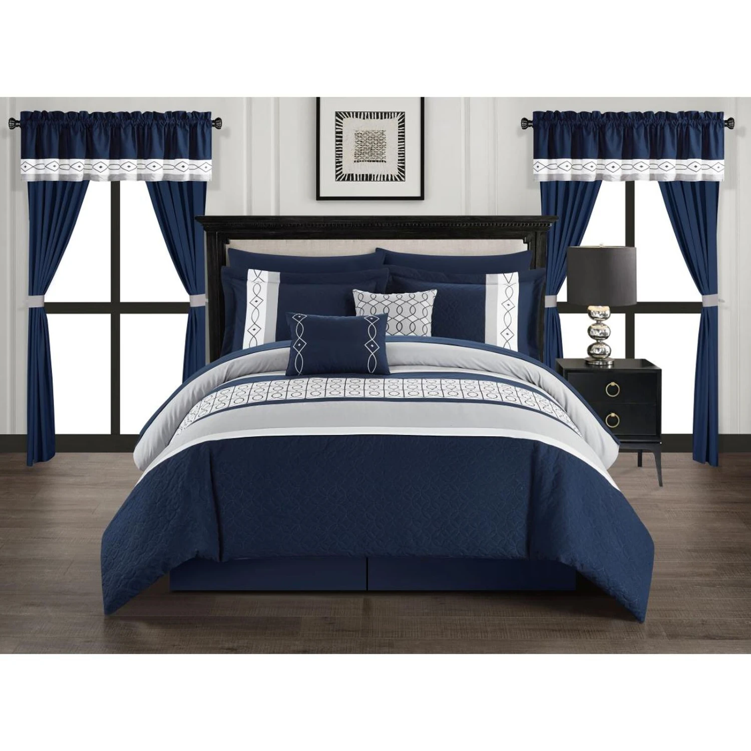 Chic Home Corinne 20 Piece Comforter Set Color Block Geometric Embroidered Bed in a Bag Bedding – Sheet Set Pillowcases Window Treatments Decorative Pillows Shams Included, Queen – Navy