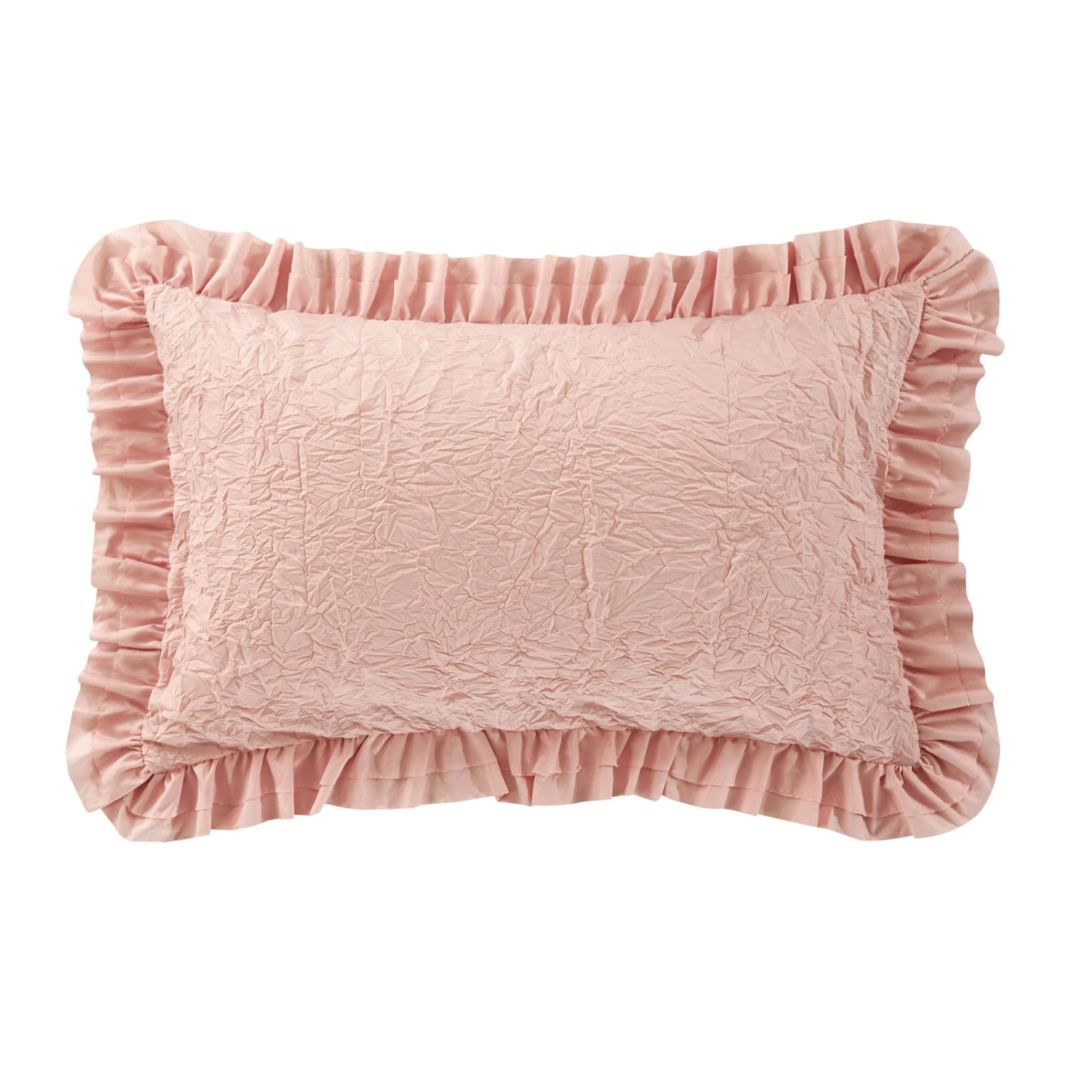 Change up your bedroom decor and give it a casual, laid back look with the unique Kensley comforter set from Chic Home. The comforter features a washed crinkle crush look on the face with a solid color backing and a double layer ruffled flange border. Two unique decorative pillows and two design coordinated shams complete the look. Available Size: Queen. Color: Blush.