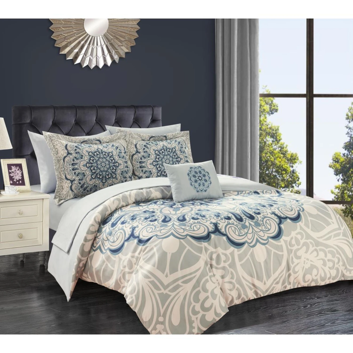 Chic Home Nizza 8 Piece Reversible Comforter Set Large Scale Boho Inspired Medallion Paisley Print Design Bed in a Bag – Sheet Set Pillowcases Decorative Pillow Shams Included, Queen – Blue,