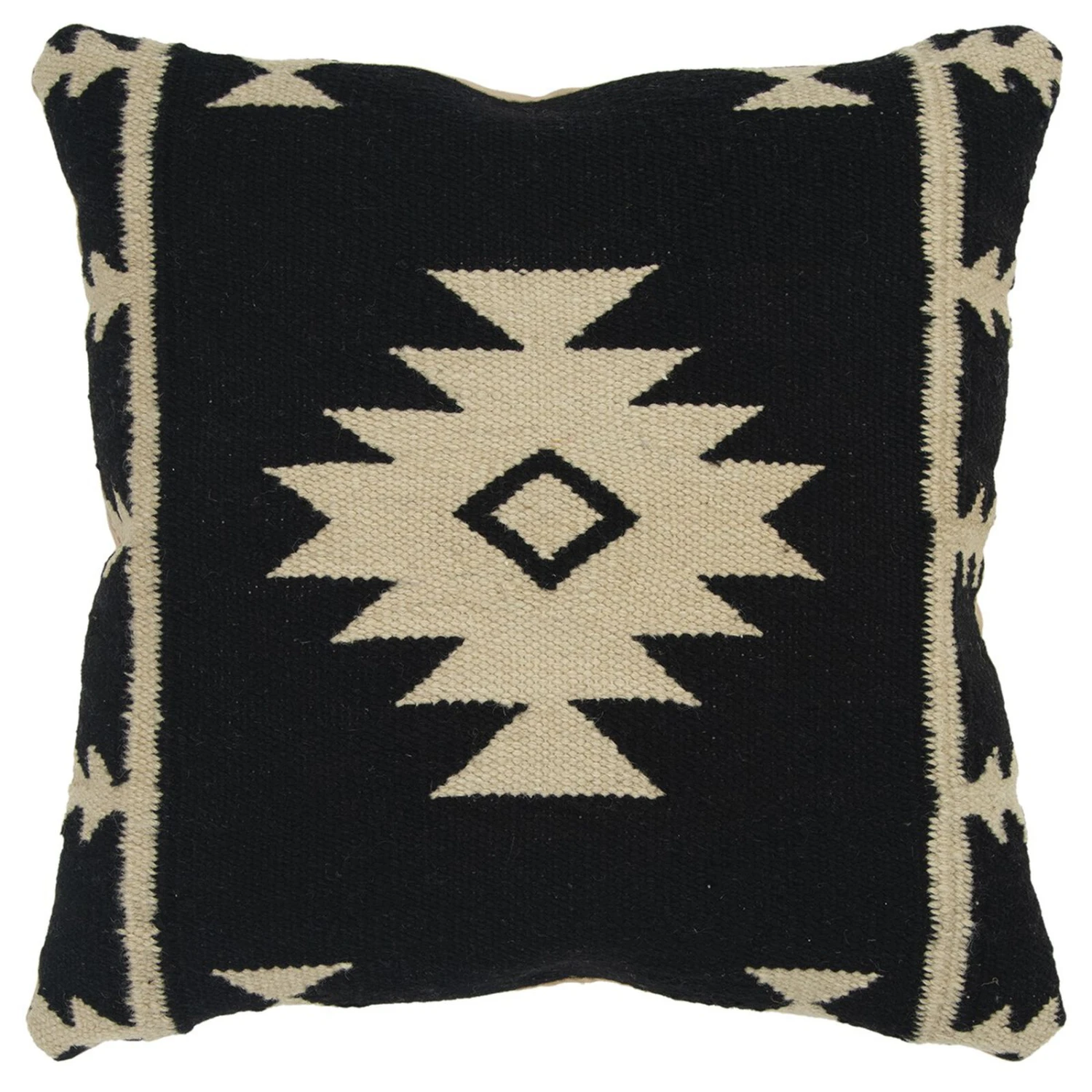 Representing global cultures with modern artistry, this Black Beige Tribal Woven Pattern Throw Pillow stands out in its tones and textures to be an ideal fit in any modern or traditional home. The tribal motif in beige creates a stunning contrast over the charcoal black base, emphasizing an authentic tribal essence with a modern flair. Skilfully handcrafted with wool yarns in a classic flat weaving technique to ensure a sturdy construction with a plush surface texture. This two-colored pillow is down-filled for an airy-soft feel and fluffy appearance which is meant to offer maximum comfort every time you sit or lie on it. With a solid coordinating back and hidden zipper closure, the pillow has a unified look while the crisp and clean aesthetics of the corners can be attributed to the knife edges all around. If you want a traditional accent without giving up on modern aesthetics, go for this exquisite throw pillow to accentuate a sense of cultural presence in the room. 18” x 18” x 6.25”