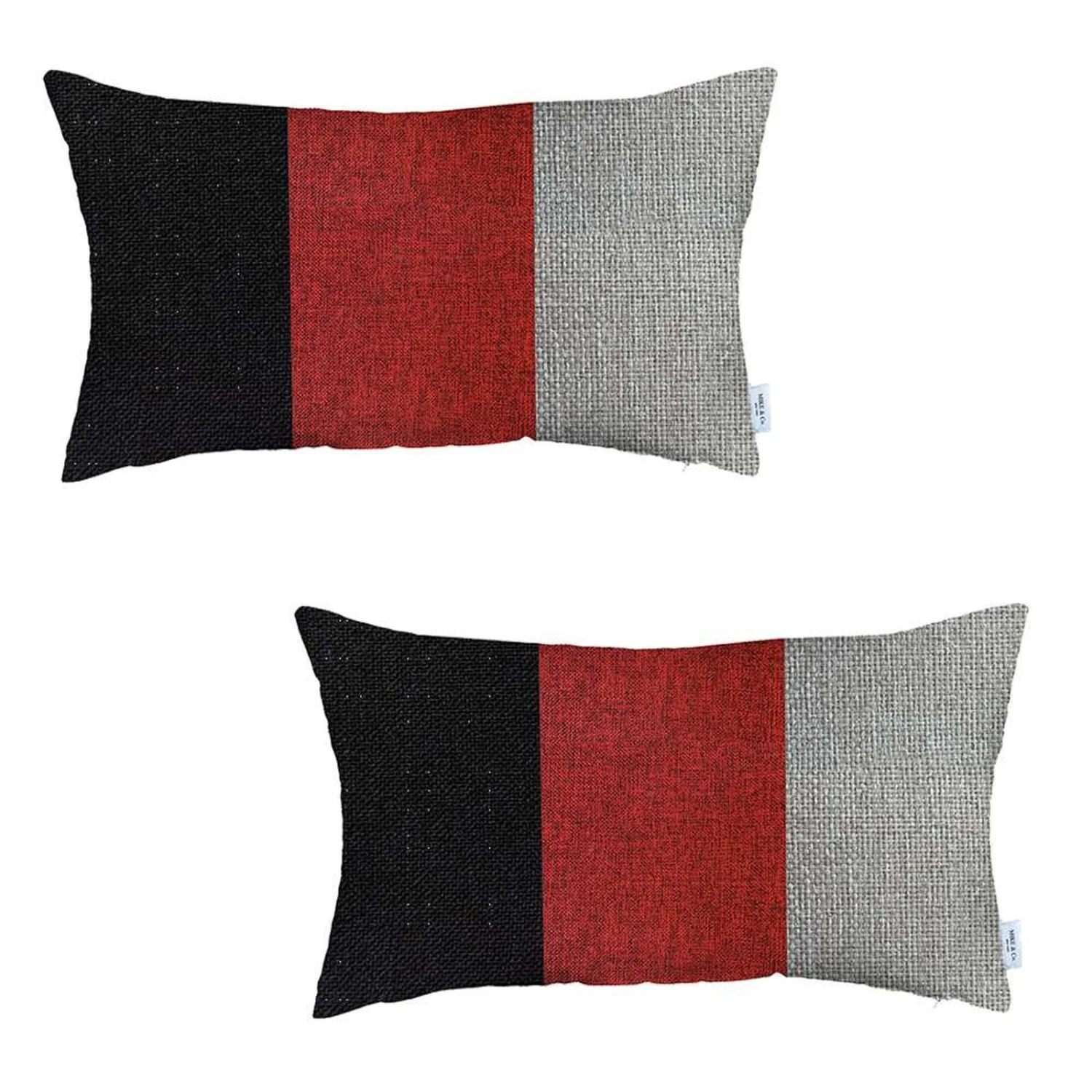 Add depth and sophistication to your modern living space with this Set of 2 Red Segmented Lumbar Pillow Covers. The tricolor striped design boasting charcoal black, ruby red, and ivory creates a stunning visual contrast while suiting any modern decor. Handmade by Turkish artisans using 100% polyester fabric that is OEKO-TEX Standard 100 certified to ensure product safety, enhanced durability, and color vibrance. Marks and blemishes should only be taken care of with spot cleaning to help maintain the immaculate look. The sleek design remains uninterrupted throughout the body of this cover due to the hidden zipper closure. This classy set of 2 covers work wonders with dark and neutral shades to bring a unique contemporary appeal to the look. 12” x 20” each. Set of 2.