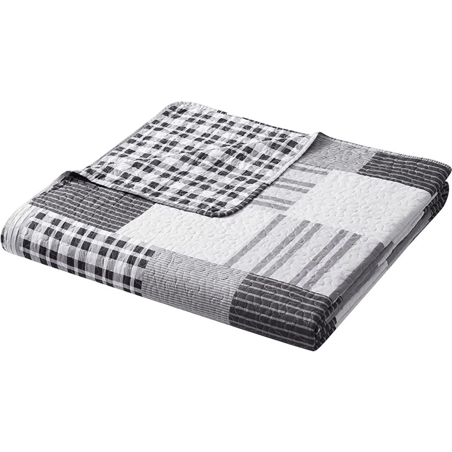 This quilt has beautiful reversible grey and white patchwork patterns. 3 Piece sets include one oversized bedspread and two shams. The ensemble offers a variety of expertly crafted details that complete the relaxed presentation. These bedspreads are made with 100% high quality ultra-soft microfiber and are machine washable on gentle cycle in cold water for easy cleaning and maintenance. Tumble dry on low. Match curtains are available sold separately. NOTE Colors may be slightly brighter or slightly darker, depending on the resolution of your monitor! Bedspread depicted here is for demonstrative purposes only. Actual bedspread may or may not touch the floor depending on the mattress’s thickness (height) and the height of bed frame/railing.
