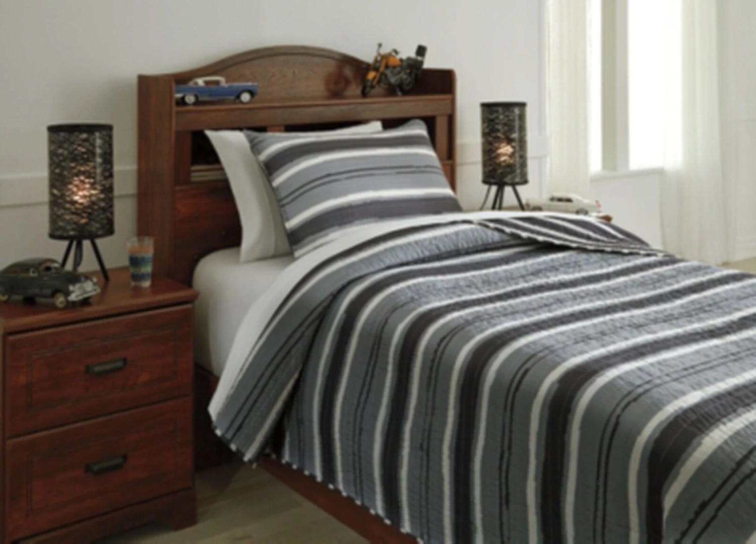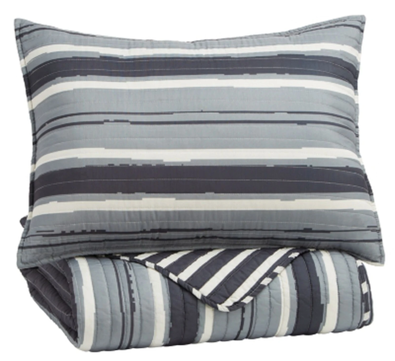 Get two feel-good looks in one with this full coverlet set. Show the fashion-forward graphic stripe pattern or the small stripe pattern. Both sides in cream and shades of gray. No matter what you choose, your bed will be dressed in style and comfort.