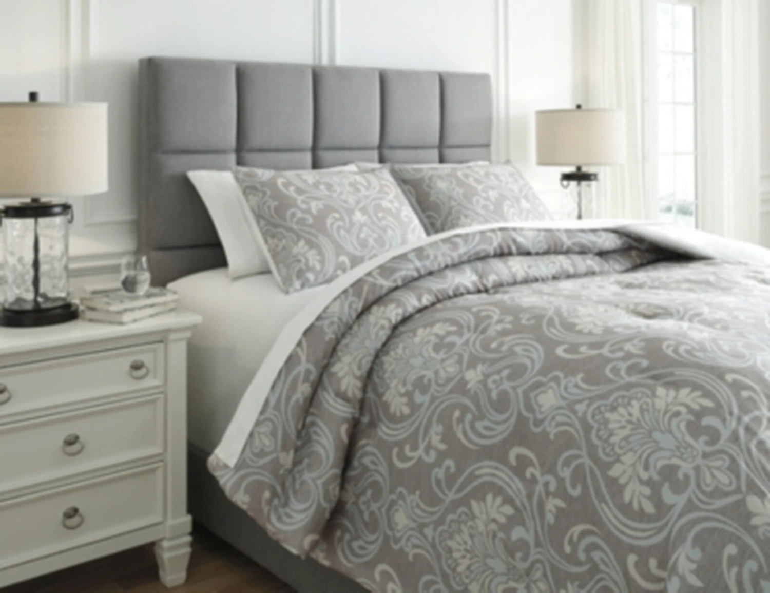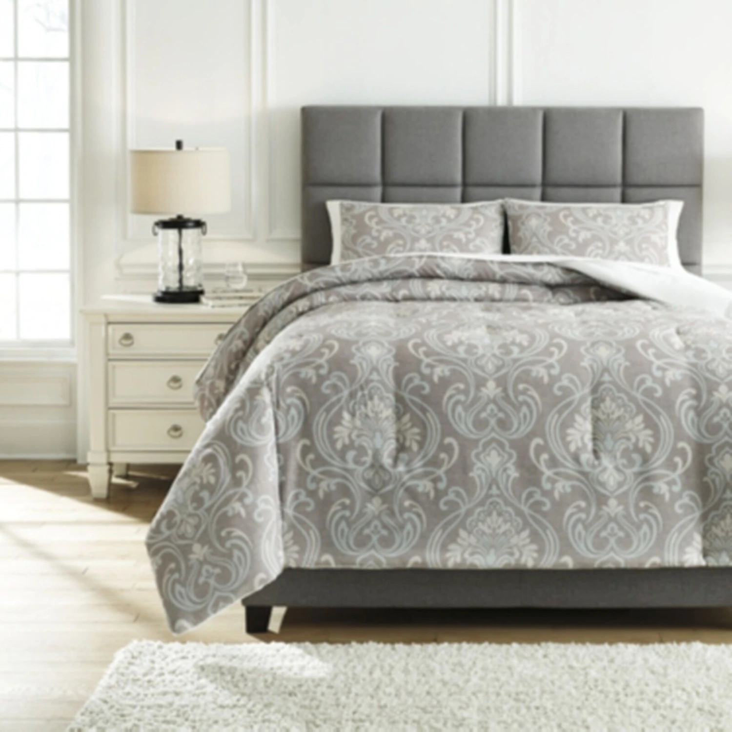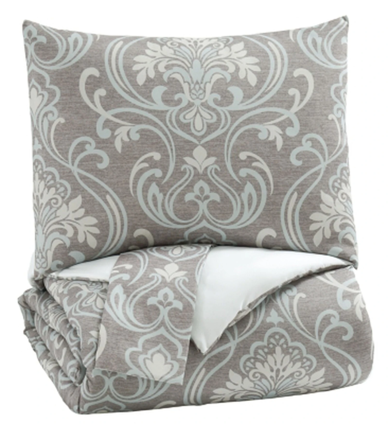 Sporting soft and subtle shades of gray, light blue and tan, this king comforter set renews our love of neutrals. Marvelous medallion design adds a touch of instant romance.