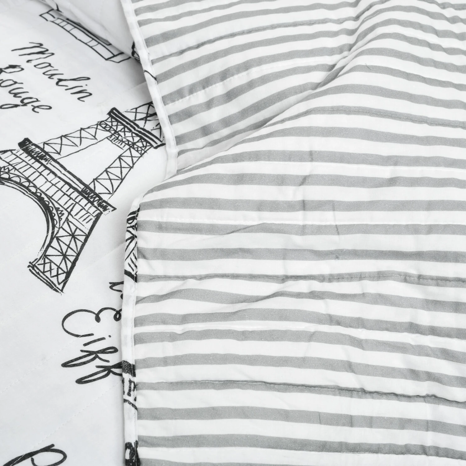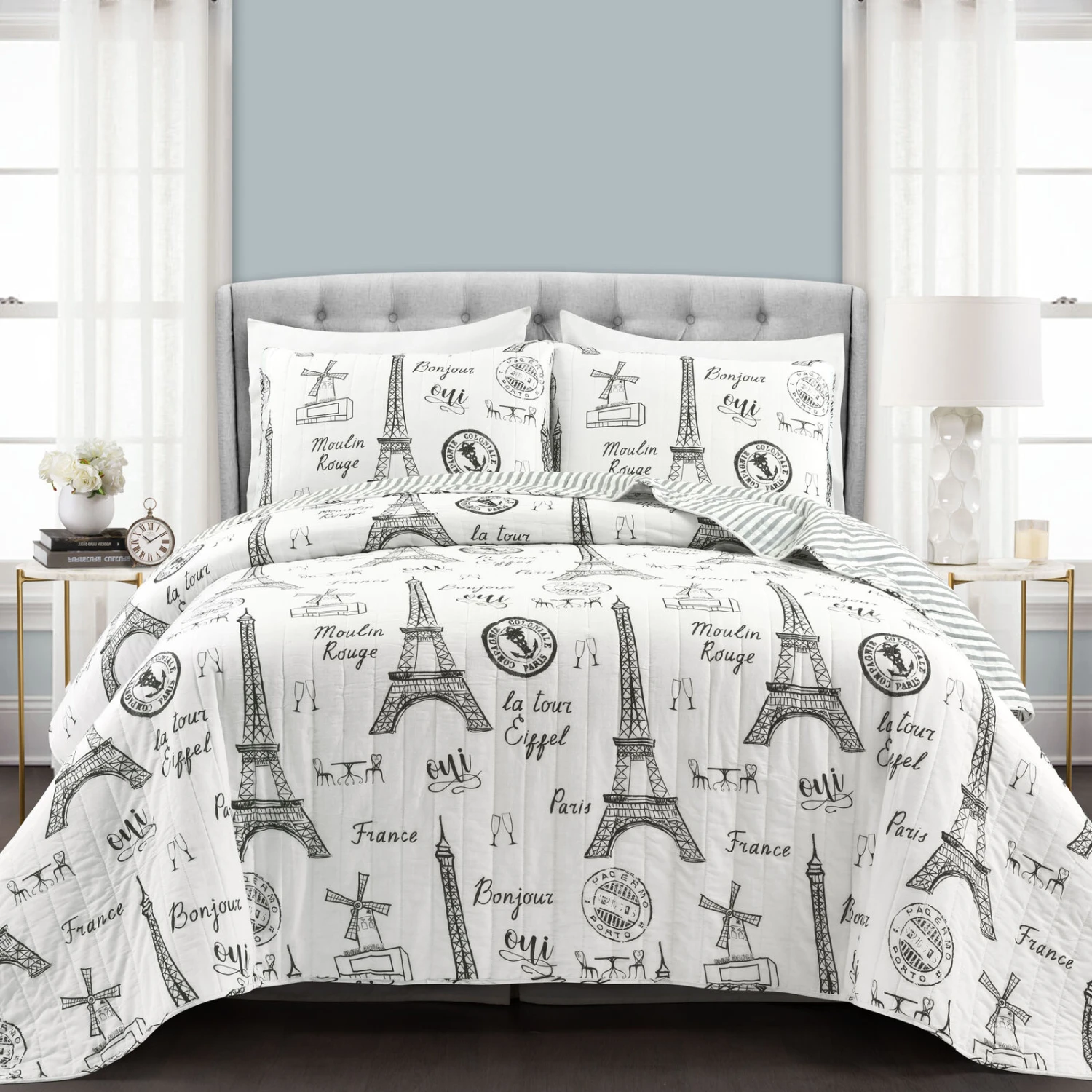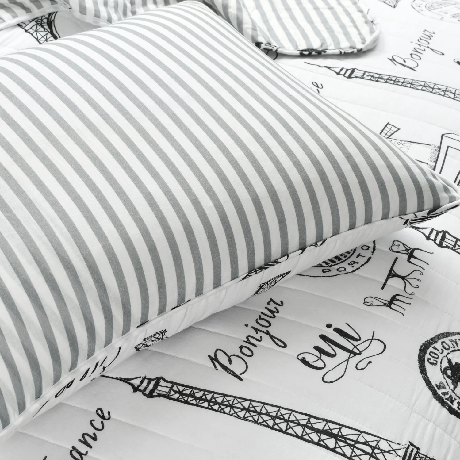 This stylish quilt set is printed with beautiful Paris-inspired icons and an elegant stripe reverse side. The cotton fabrication is soft to the touch and very breathable. This set includes one quilt and two shams.