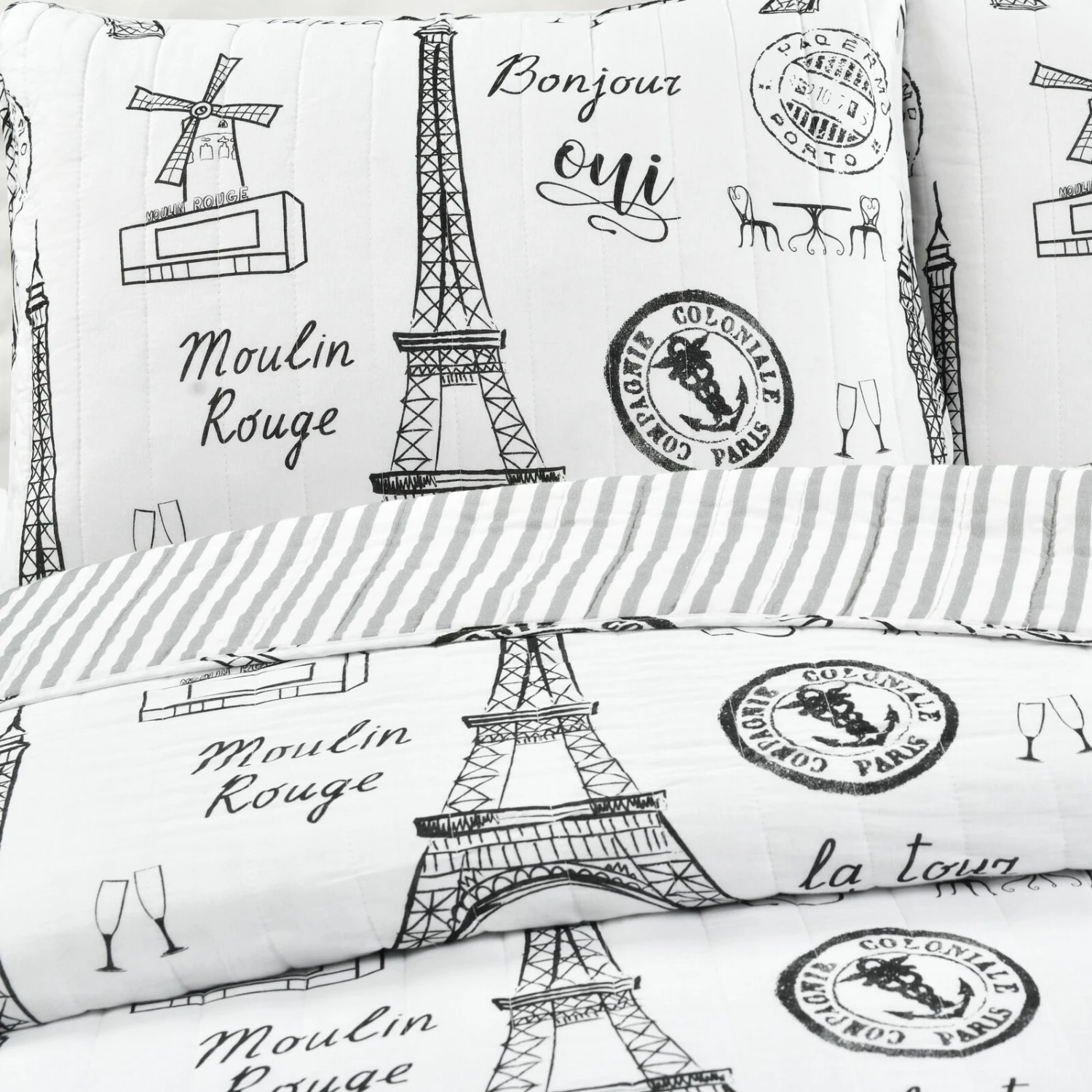 Paris Bonjour Reversible Cotton Quilt Black/White 3Pc Set King