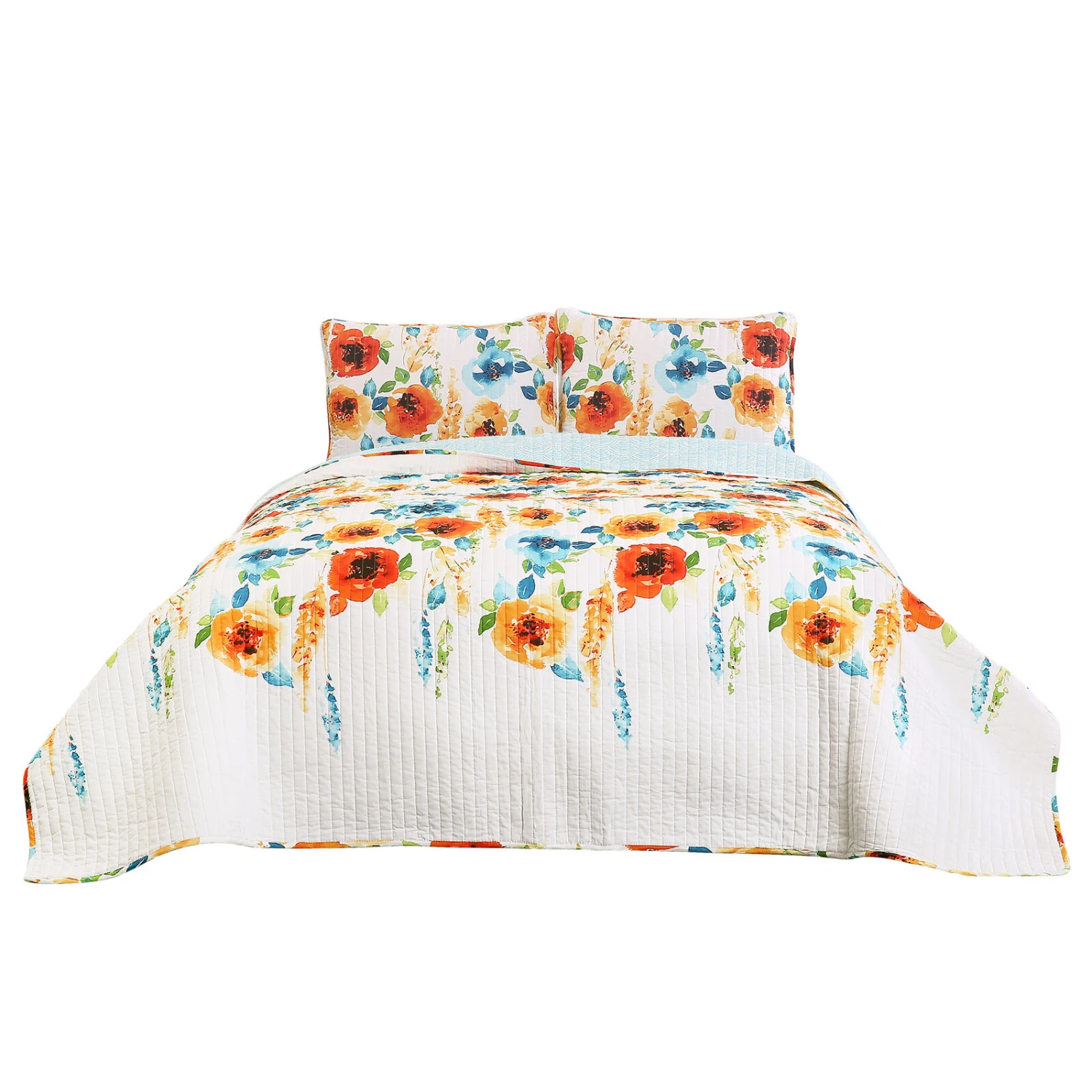 Bright blooming flowers printed on 100% cotton will energize your bedroom. The colors pop off the white background of the quilt & matching shams. The reverse side features a subtle print, allowing you to change the look of your room at a moment’s notice.